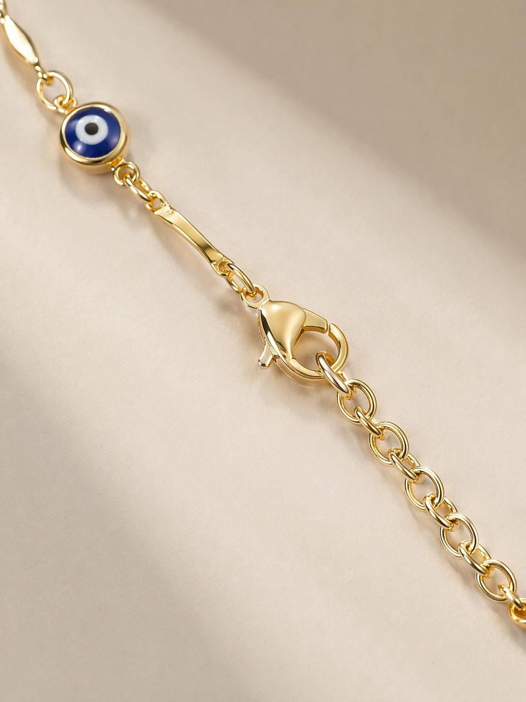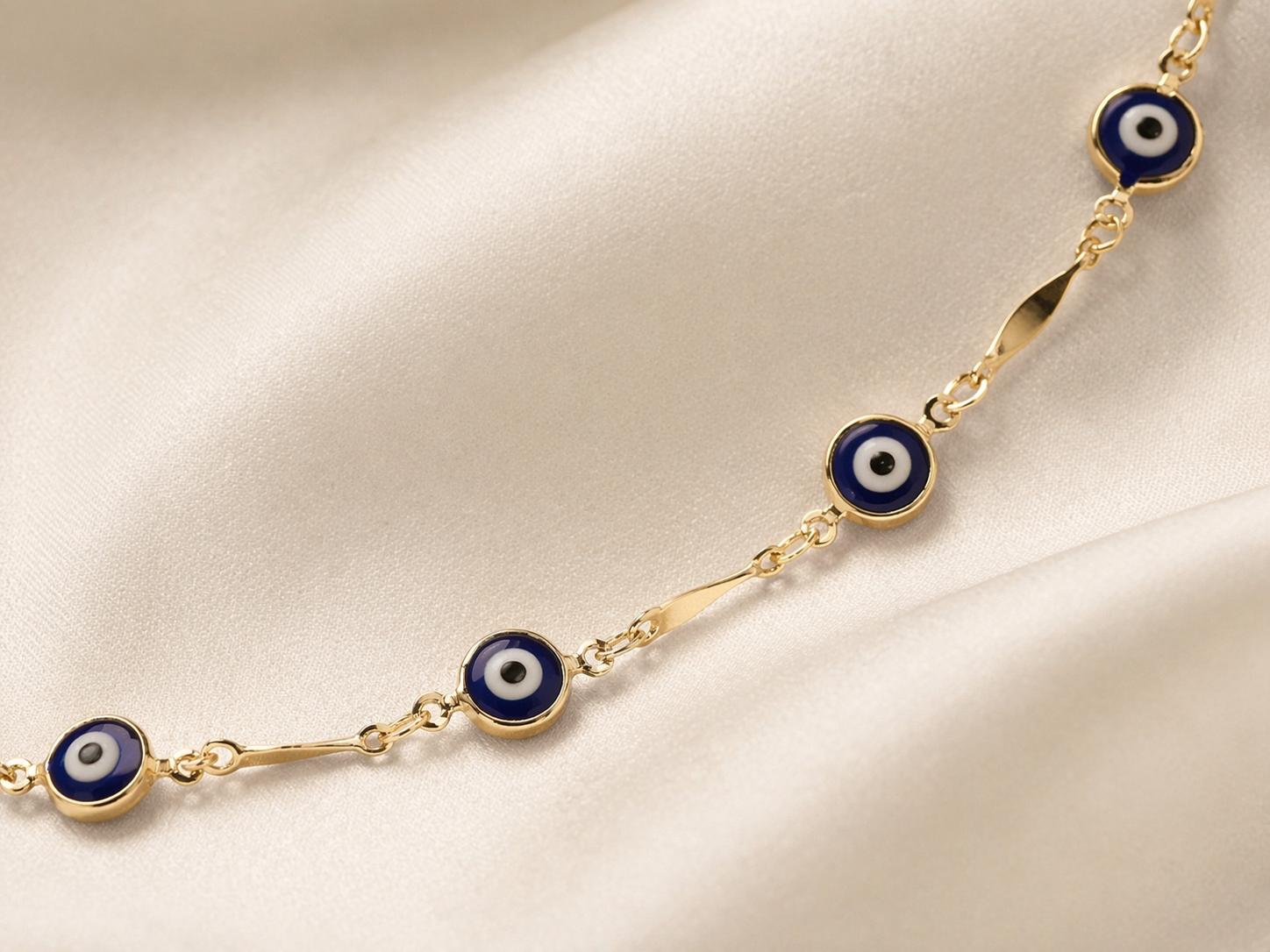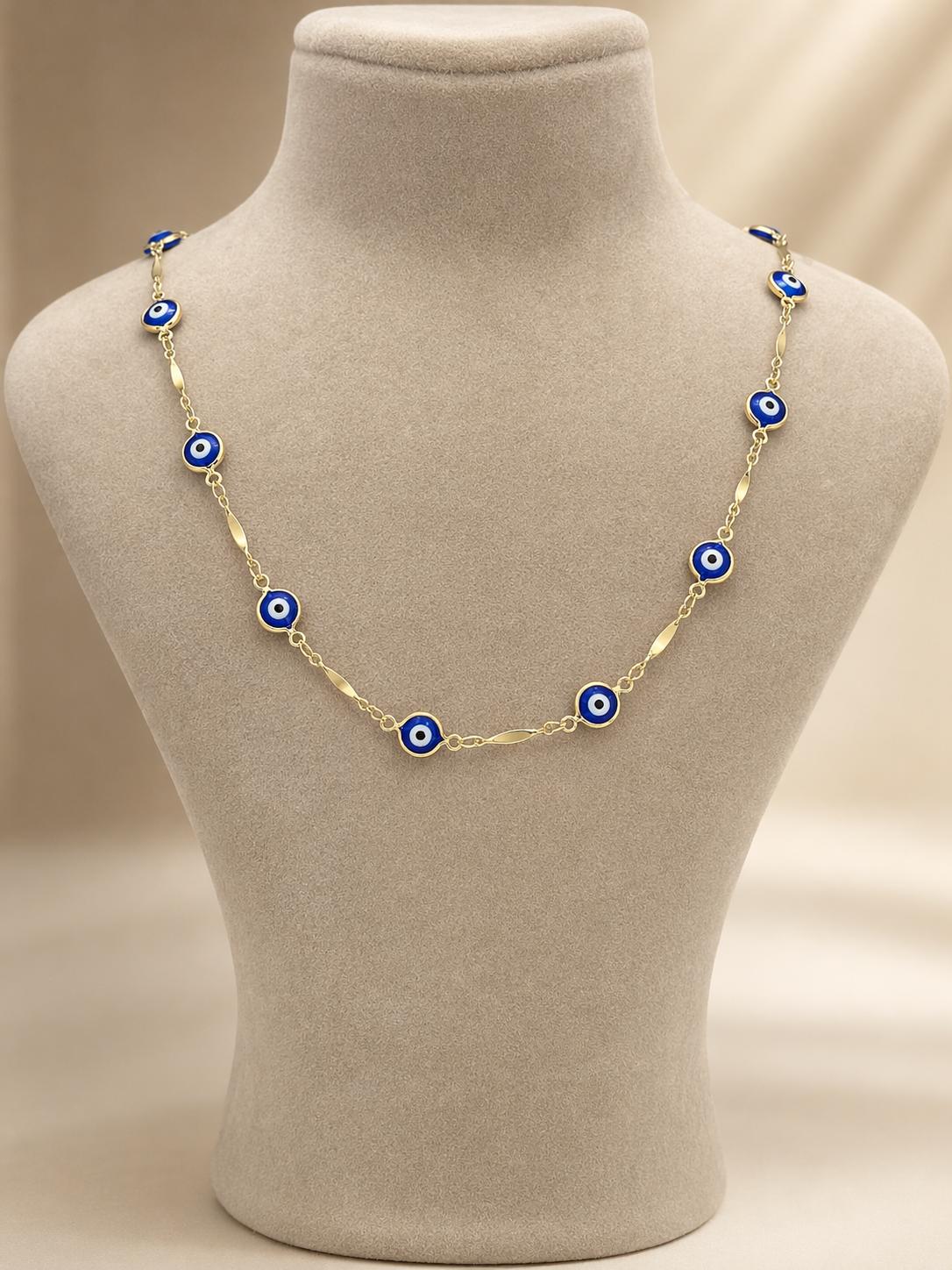 Altın ton zincir üzerine yerleştirilmiş nazar boncuk detaylarıyla zarif ve anlamlı kadın kolye modeli.