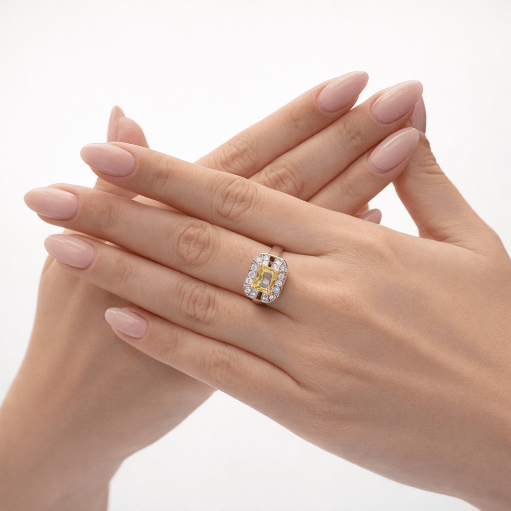 Zirkon çerçeveli dikdörtgen sarı taşlı şık kadın yüzük