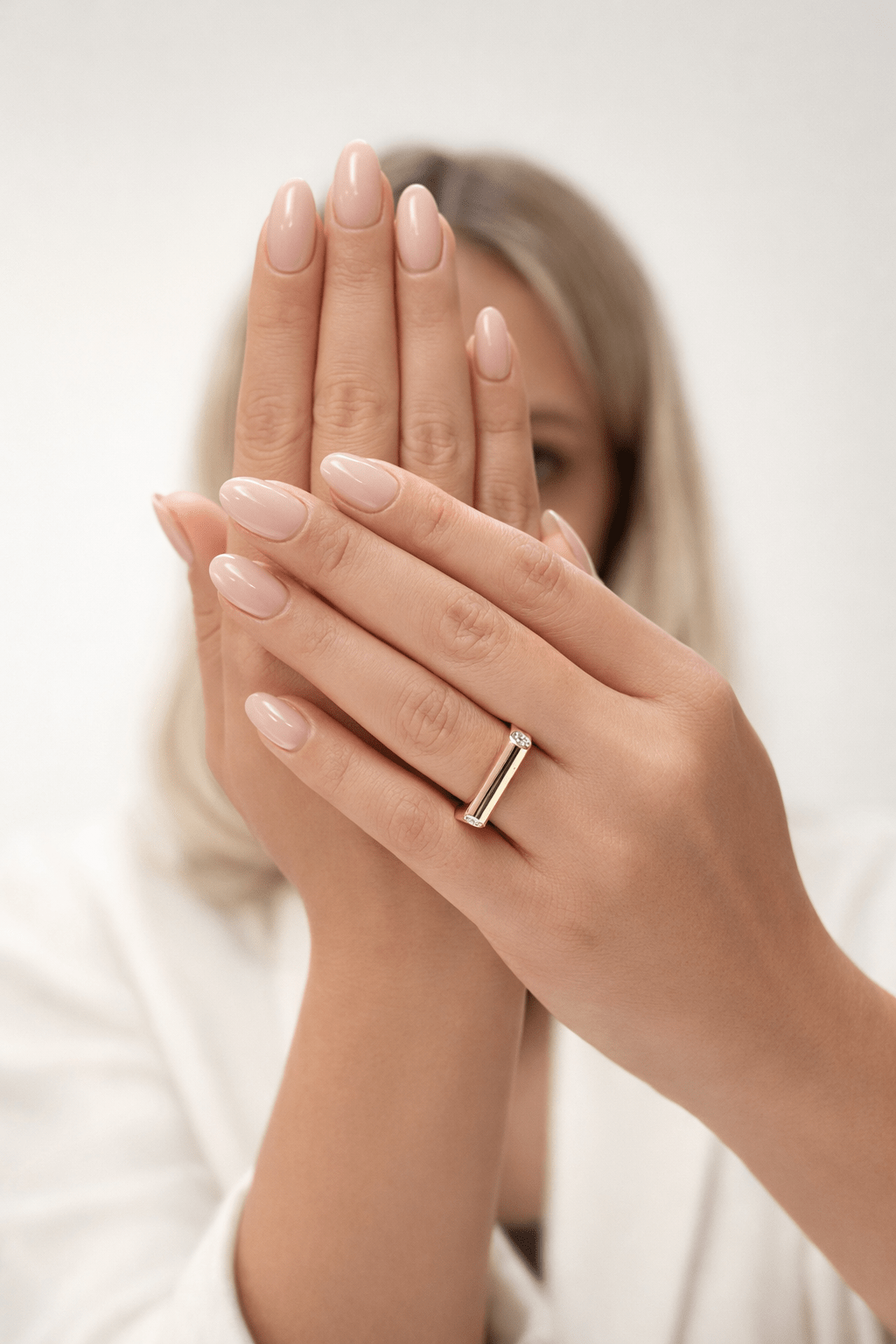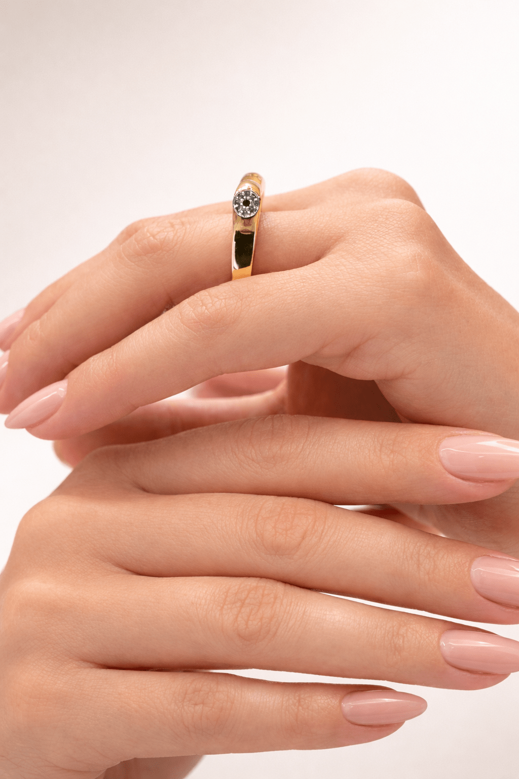 Bezel taş detaylı altın yüzük takan zarif kadın eli, nude pembe manikürlü, açık bej stüdyo arka planında lüks ürün çekimi