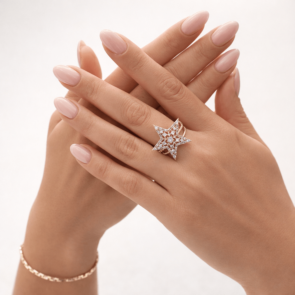 Yıldız figürlü taşlı gold kadın yüzük modelinin elde duruşu